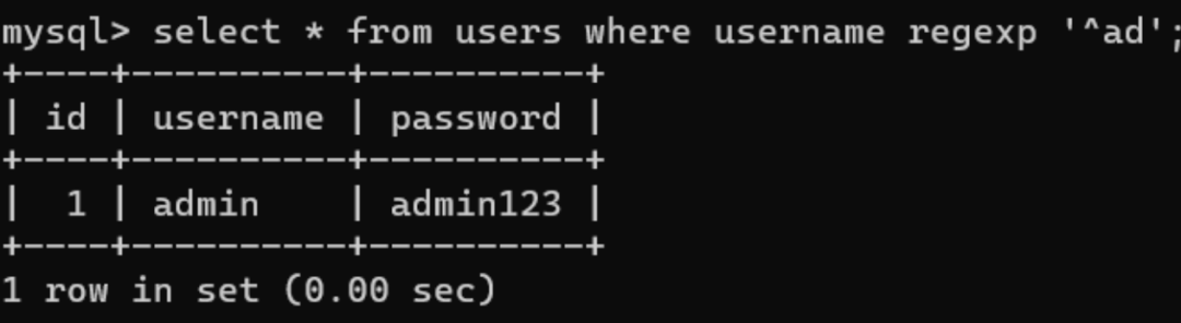 当过滤了=、in、like等关键字时,我们可以用regexp来进行绕过: