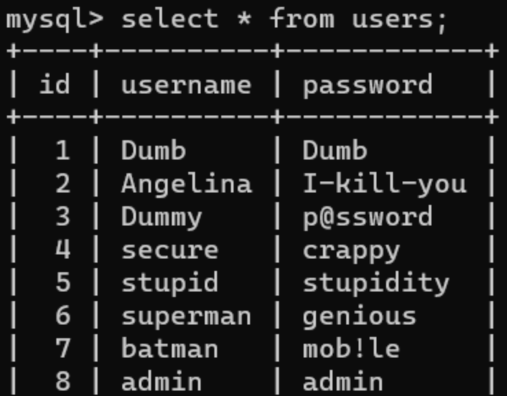select username,password from users where username='admin\' and password=' or 1# '