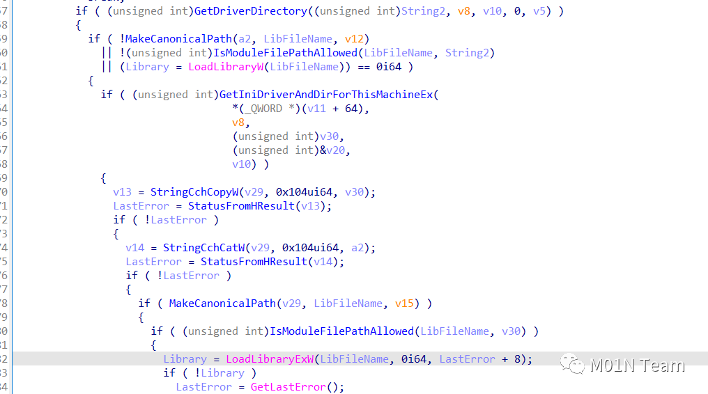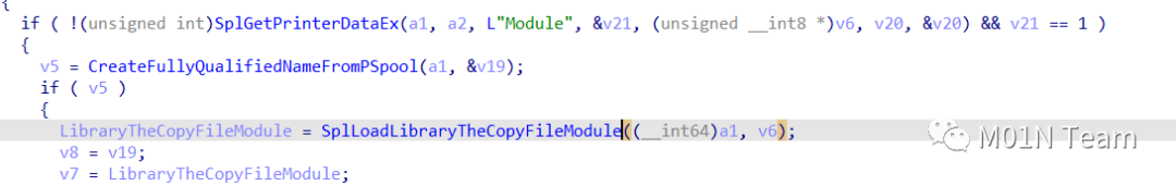 在SplLoadLibraryTheCopyFileModule中首先会对Module值进行校验,当Module键值位于C:\Windows\System32\目录下或打印机驱动目录C:\Windows\System32\spool\drivers\x64目录下,将会调用LoadLibraryW或LoadLibraryExW加载Module值对应的文件。