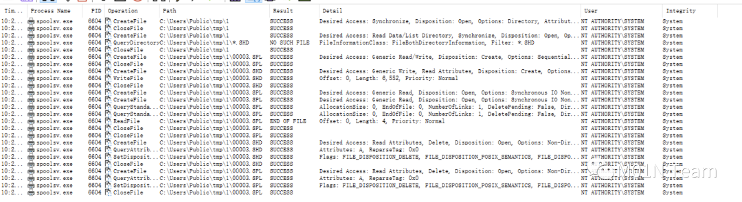 接下来随便测试一些打印机功能,例如:StartDocPrinter、StartPagePrinter、WritePrinter等,再通过Process Monitor观察这会触发spoolsv.exe在预设目录下的文件操作: