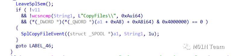 而在SetPrinterDataEx设置SpoolDirectory时并没有对该路径进行有效校验,这便出现了一个用户可控的越权操作问题。利用此漏洞需要应用Print Spooler的另外一个机制"Point and Print"。当调用SetPrinterDataEx 设置pKeyName以"CopyFiles\"开头时,会调用SplCopyFileEvent函数: