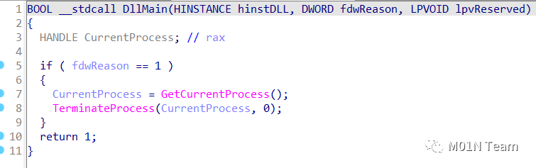 如何让打印机服务重启呢?通过对以往的漏洞分析学习[1],可以通过以上办法加载"C:\Windows\System32\AppVTerminator.dll",该文件符合路径要求,加载后会调用TerminateProcess终止spoolsv.exe进程,这将触发服务控制管理器(SCM)的恢复机制启动新的spoolsv.exe进程。