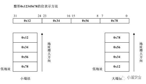 大端模式(高低高低): 字的高字节存储在低地址字节单元中,字的低字节存储在高地址字节单元中。