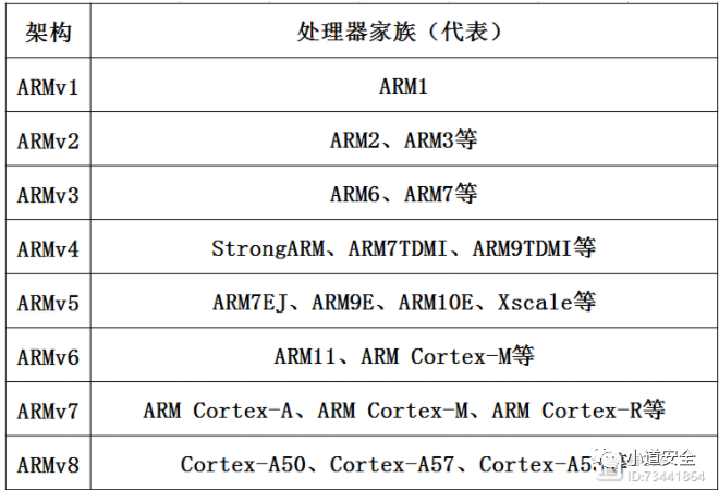 分别为:ARMv1、ARMv2、ARMv3、ARMv4、ARMv5、ARMv6、ARMv7、ARMv8、ARMv9。