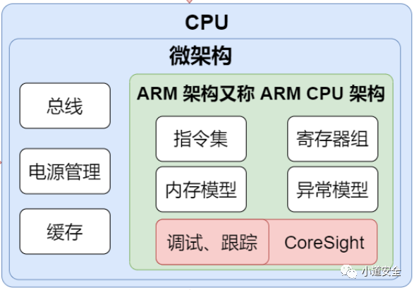AMR架构又称为ARM CPU架构,它包含:指令集、寄存器组、异常模型、内存模型、调试,跟踪和分析。