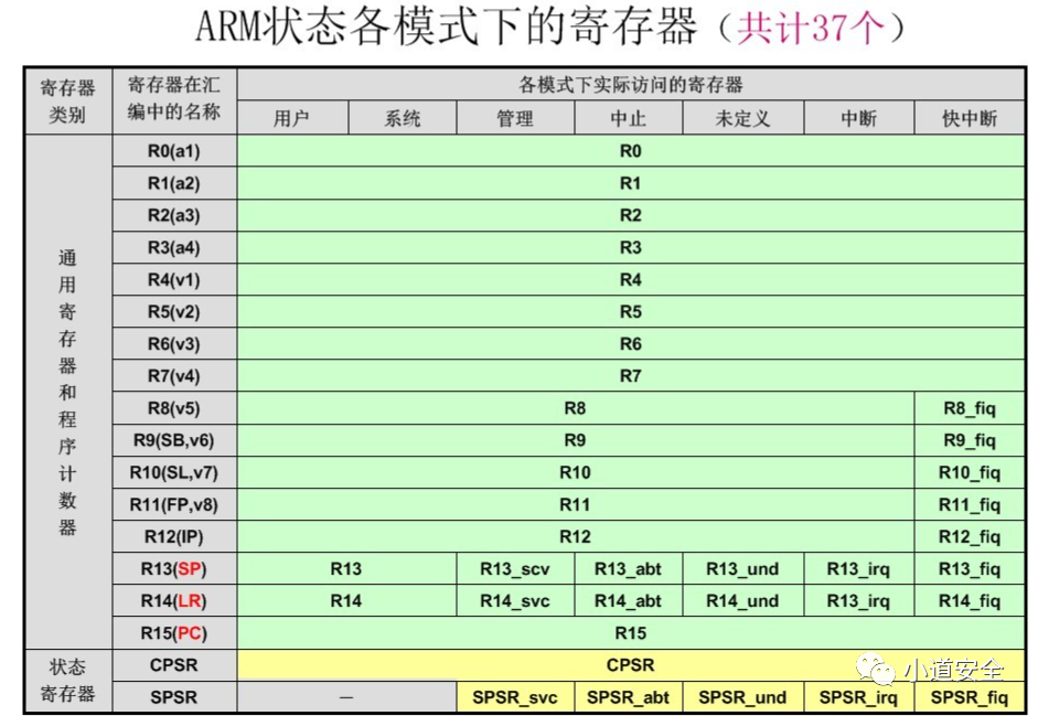 ARM32共有37个32位寄存器,其中31个通用寄存器,6个状态寄存器。