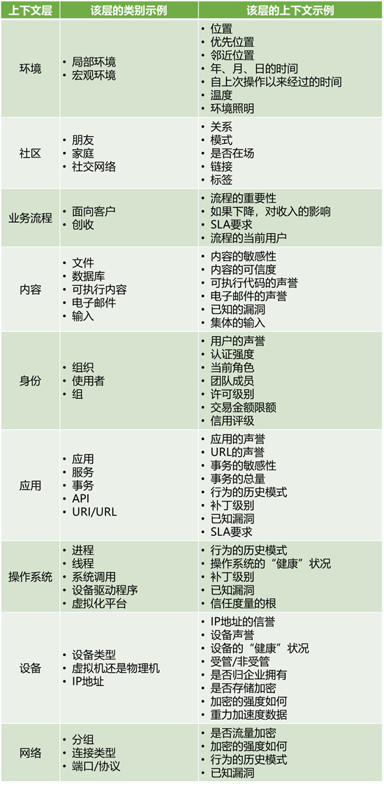 为了能够更快、更准确地度量信任级别,评估是否应该允许或拒绝给定的操作,我们必须在做出安全决策时纳入更多实时上下文信息。这是上下文感知安全的核心。除了经常使用的环境上下文(如位置和时间),还有多种类型的上下文信息,可用于改进安全决策。图5中显示的任何层,都可以为改进安全决策提供额外的上下文。下表罗列了各个层中的上下文示例: