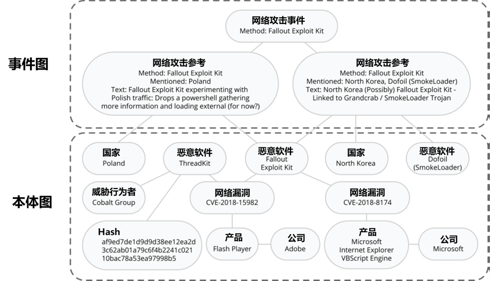 RecordedFuture称:安全情报图谱(Security Intelligence Graph)代表了RecordedFuture用来完成使命的方法论和专利技术。安全情报图谱用于指导人类分析师和算法的分析过程。RecordedFuture安全情报图谱综合了各种各样的情报信息,如下图所示:图10-RecordedFuture安全情报图谱的信息安全情报图谱连接了数十亿个实体,通过本体和事件,映射网络安全领域中的各种复杂关系。如下图所示: