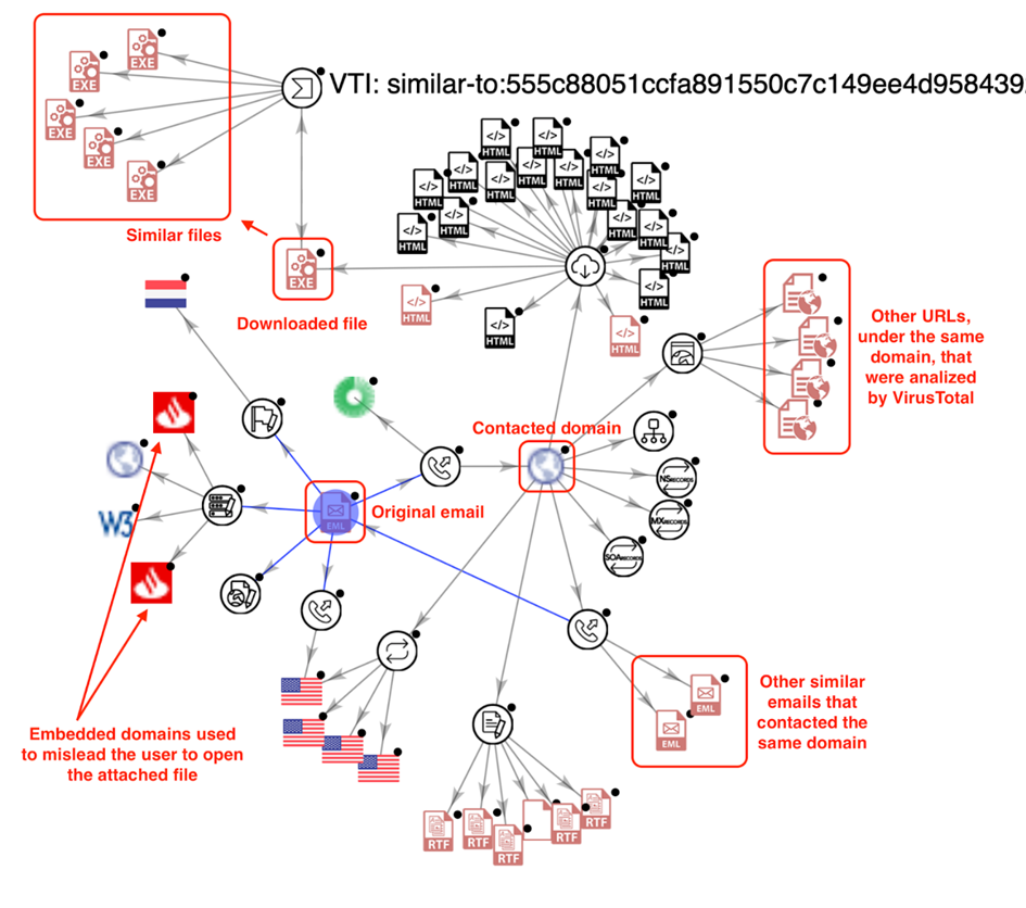 VirusTotal称:“上下文是王道(Context is king)”。可见其对上下文之重视。VirusTotal认为:你不能仅仅依靠“一枚子弹”(即一个样本)或“一块拼板”(即你的本地数据),来与全球范围内的攻击者进行战斗。你需要有持续跟踪恶意活动的“整部电影”,必须有尽量完整的上下文。VirusTotal图谱(VirusTotal Graph)正是你的救星。VirusTotal图谱充分利用各种实体的属性和关系,以可视化方式,浏览或搜索VirusTotal的海量数据集,高效执行安全事件和威胁的调查。如下图所示:3)CrowdStrike威胁图谱