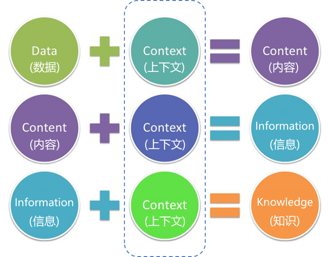 上下文的价值。从上图可以看出,上下文(Context)分别赋予了数据(Data)、内容(Content)、信息(Information)以更多的意义和价值。正是在上下文的作用下,数据转化成内容,内容转化成信息,信息转化成知识。上下文(Context)和内容(Content)是既对立又统一的关系。两者相辅相成,还可以相互转化。