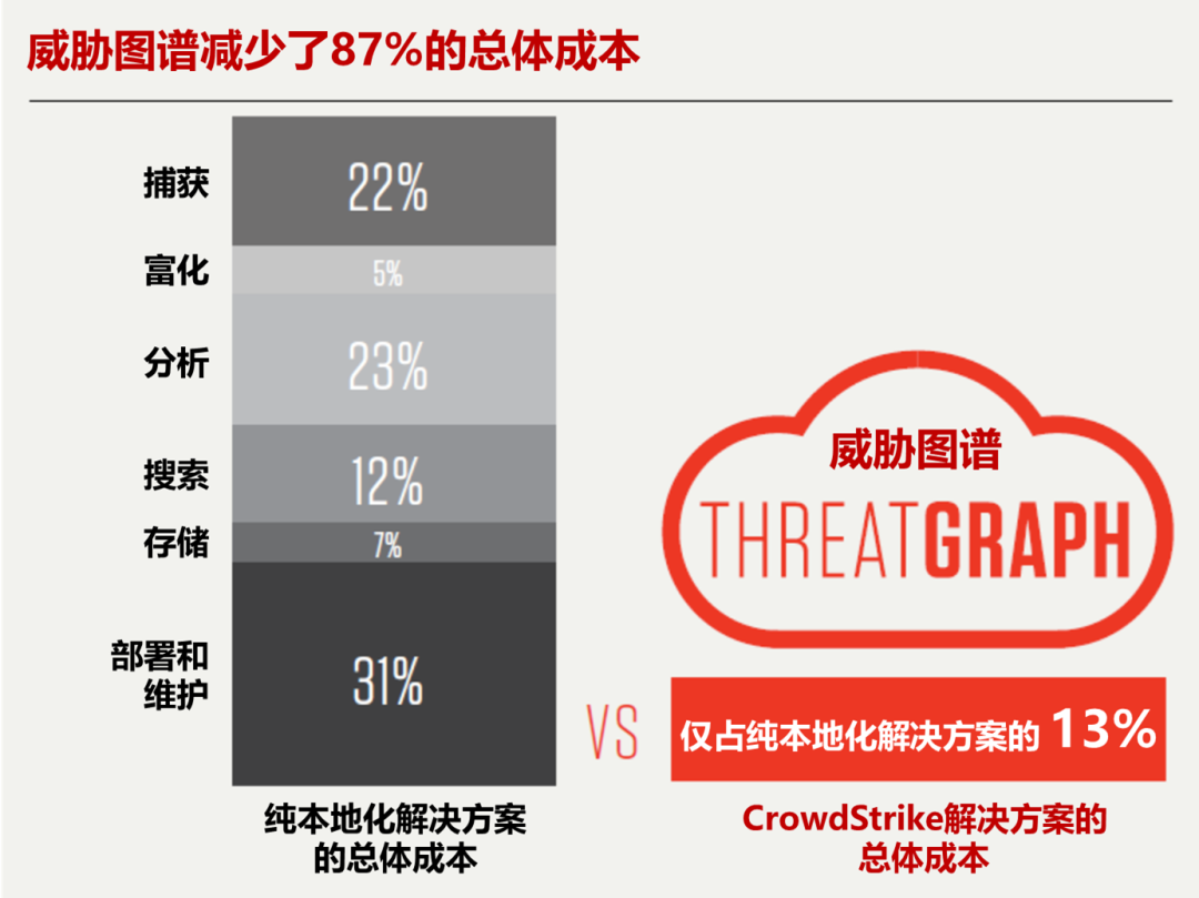 安全的未来在云端。如果安全的未来是上下文,得到的下一个推论就是:安全的未来在云端。因为孤岛式、分散式的上下文是非常低效的,也不具备共享和扩散的价值。安全上下文需要集中化、规模化、图谱化,而只有云化才能承载这样的要求。安全的未来是SaaS化。如果安全的未来在云端,得到的下一个推论就是:安全的未来是SaaS化。虽然很多人都会争论说,SaaS只适合中小客户,并不适合大型客户。但笔者觉得,恰当的说法是:仅有SaaS,是不适合大型客户的。大型客户的最佳策略应该修正为:客户本地化安全建设+厂商云化安全服务(如图13所示)。安全的未来是安全云。安全是要花钱的。我们不能平等地保护一切,我们所保护的一切也不是同等价值。网络安全预算不大可能以比整体IT预算更快的速度增长。预算和资源的限制,将迫使我们不断优化风险/回报比,并采取智能化的安全保护措施。这正是安全云的意义所在(如图13所示)。与其部署所有可能的安全控制措施,不如根据所请求操作的上下文(如受保护过程的重要性、所处理内容的敏感度、所涉及实体的信任度、客户的风险容忍度等),采取更加智能化的控制措施。不论称之为“基于信任”、“基于风险”、“基于度量”、“基于智能”的安全转型,上下文感知都是最关键的促成因素。图13-CrowdStrike云化威胁图谱与纯本地化解决方案的成本比较CrowdStrike称:“大数据、图谱、云是阻止当今威胁的三个关键。” 这三个关键,一个都不能少。而三者合在一起,就是CrowdStrike威胁图谱,也正是笔者所说的“安全云”。