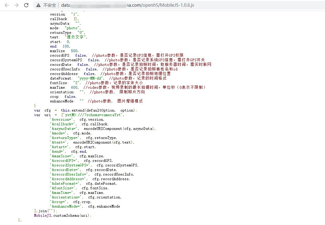 首先对/openh5/MobileJS-1.0.6.js文件进行分析,发现大多为相似的功能函数,看代码应该是拉起手机的某些功能,并未发现敏感的路径或接口信息。