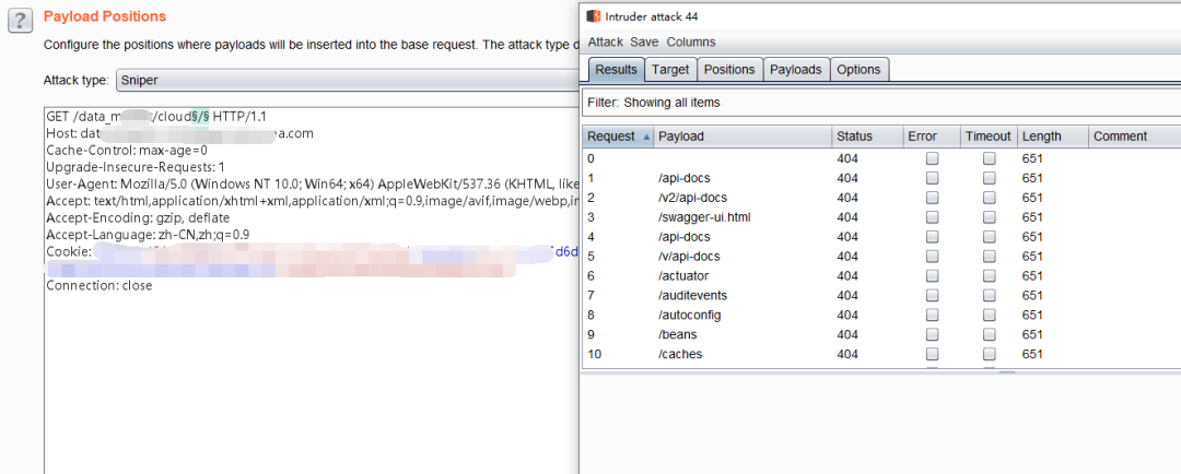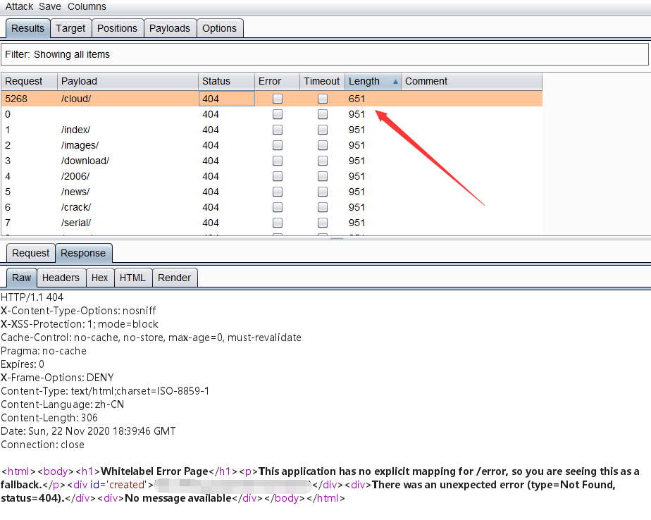 放入目录字典进行Fuzz测试,这里选择使用Burpsuite的原因是,SpringBoot目录的访问报错,状态码依然是404,而使用Burpsuite的返回值Length长度,可以轻松筛选出是否成功爆破到了SpringBoot目录。