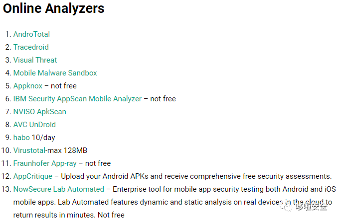 13.NowSecure Lab Automated – 对于Android和iOS移动应用程序进行安全测试,该工具可以自动对上传的软件进行静态和动态分析并返回扫描结果;收费