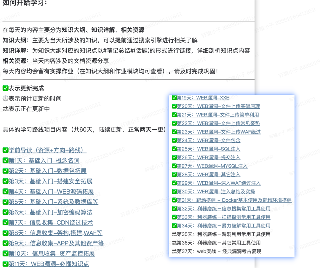 目标是针对性地帮每一位同学指明学习的方向、领悟高效的学习方法、提供学习路上的所需的基础教程、相关工具、靶机环境、干货笔记等等你能想到的相关学习资源,为掌握独立网络安全渗透测试的思路技巧和实战技能持续添砖加瓦不走弯路!帮你走在更多同学前面!