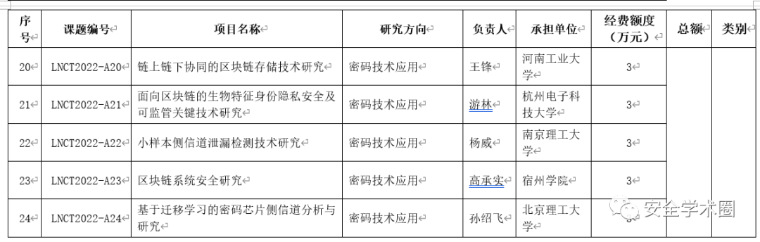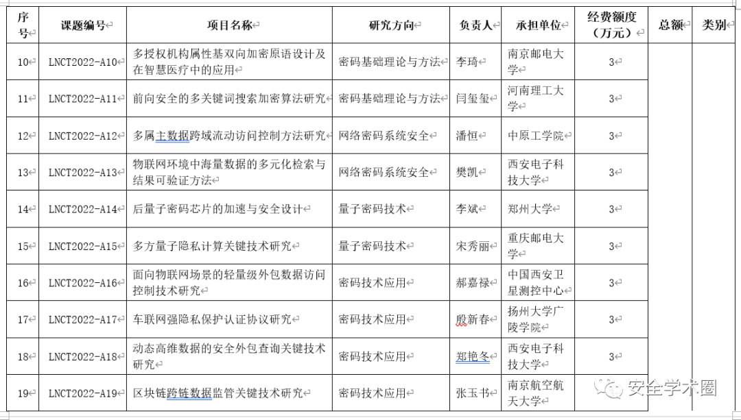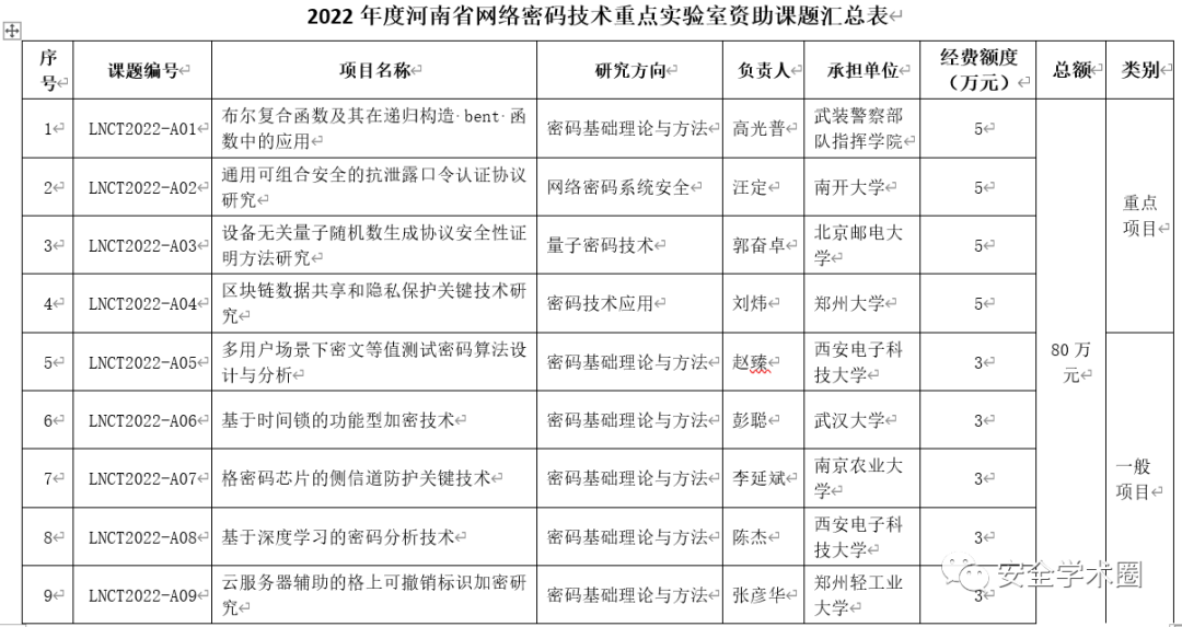 安全学术圈在2022年发布了"2022年河南省网络密码技术重点实验室研究课题"的申请,目前该课题评审工作已经结束,2022年度河南省网络密码技术重点实验室资助课题汇总表如下,恭喜各位老师,公示时间:2
