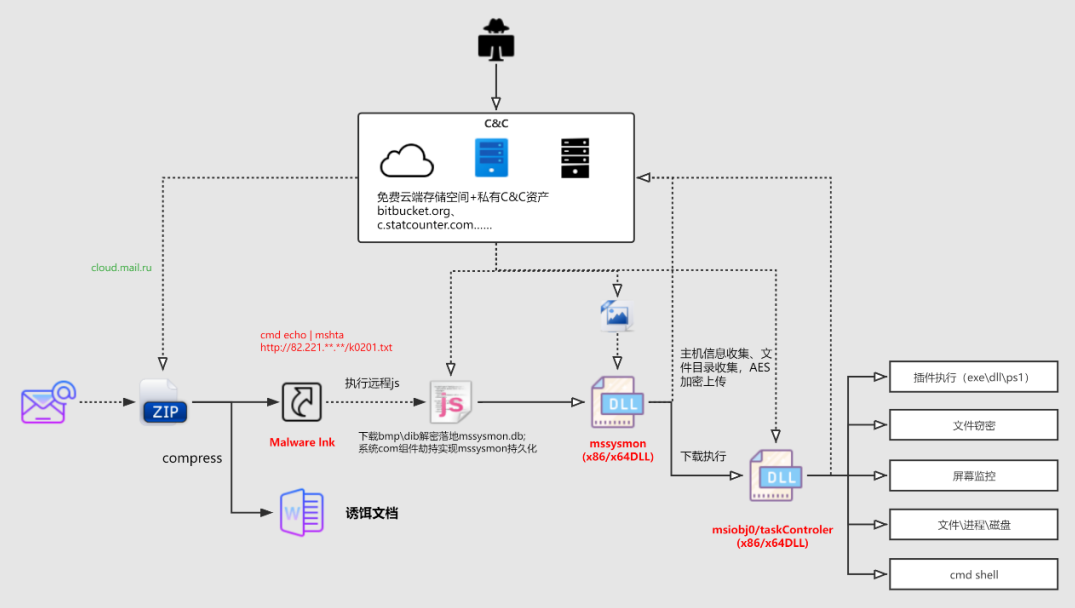 3. 攻击者用于攻击载荷托管、C&C通信的网络资产包括公开免费的云端存储站点(如bitbucket.org、statcounter.com)和攻击者私有C&C资产。木马回连地址会涉及这两类的多个url地址。