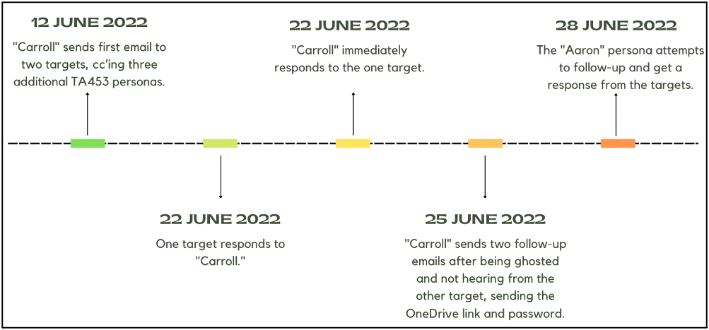 TA453(Charming Kitten)是一个伊朗威胁组织,曾攻击中东的学者和政策专家。2022年6月,TA453组织使用一种新的、精心设计的网络钓鱼技术,通过使用多个角色和电子邮件帐户,诱导目标认为这是一个真实的电子邮件对话。研究人员将这种社会工程技术称为“多角色模拟”(MPI)。攻击者向目标发送一封电子邮件,同时抄送由攻击者控制的另一个电子邮件地址,然后从该电子邮件中回复,进行虚假对话。此次活动的目标包括从事中东研究或核安全的研究人员。