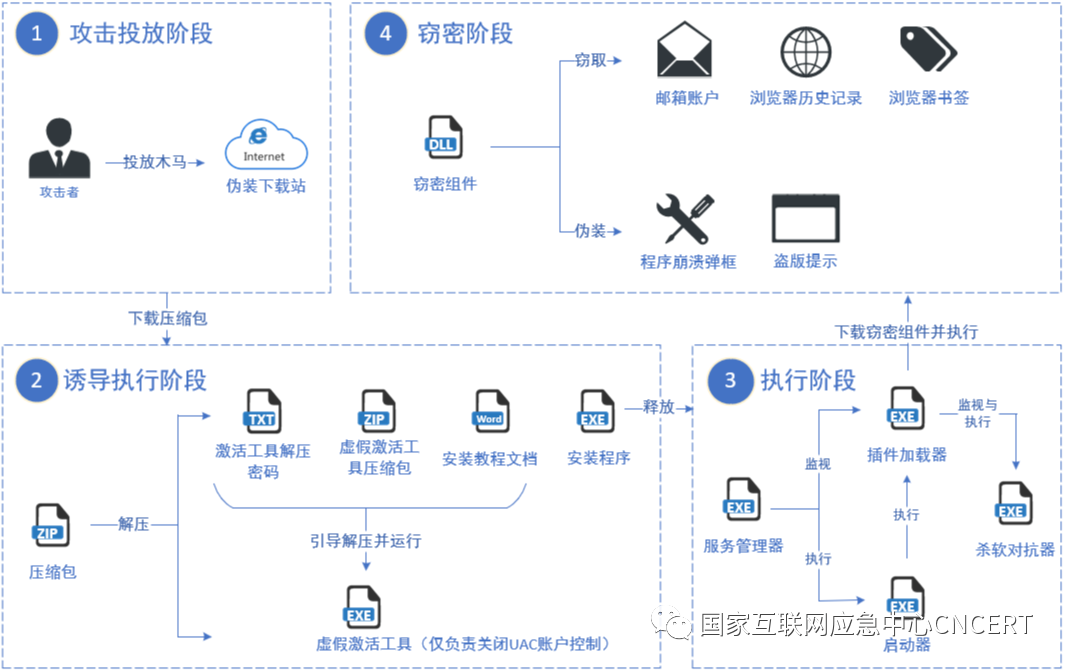 攻击者利用“cdr[.]jyxwlkj.cn”及“cdrnb[.]jyxwlkj.cn”域名建立多个软件下载页面,用于投放伪装成实用软件的“魔盗”窃密木马。窃密木马运行后会收集受害者主机中已安装的软件列表与多款浏览器的历史记录、书签数据和邮件客户端邮箱账户信息,并加密回传至攻击者服务器。由于部分恶意程序具备在线升级能力,因此攻击者可随时更改攻击载荷(如勒索、挖矿、窃密等不同目的的攻击载荷),给受害者造成更大损失。
