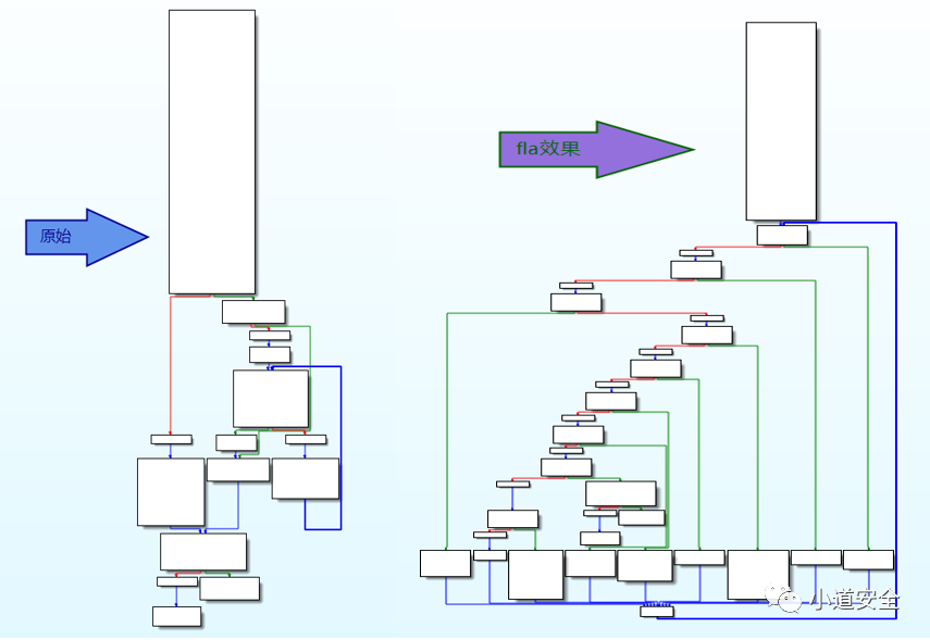 -mllvm -fla中fla的全称:Control Flow Flattening,它也称为控制流扁平化,这个功能模式主要原理就是把一些if-else语句,嵌套成do-while语句。