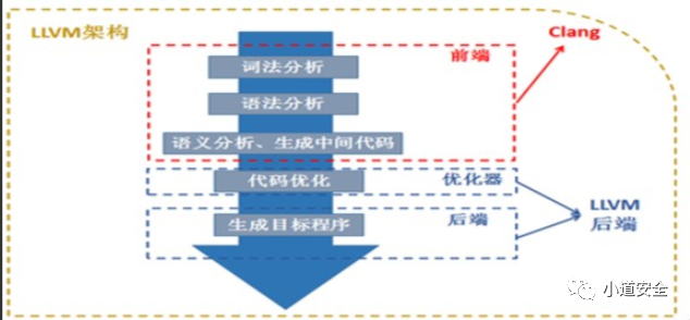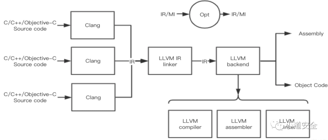 LLVM会先将源码生成为与目标机器无关的LLVMIR代码,然后把LLVMIR代码先优化,再向目标机器的汇编语言而转换。LLVM编译器主要细分为前端、中层优化和后端的3部分构成。