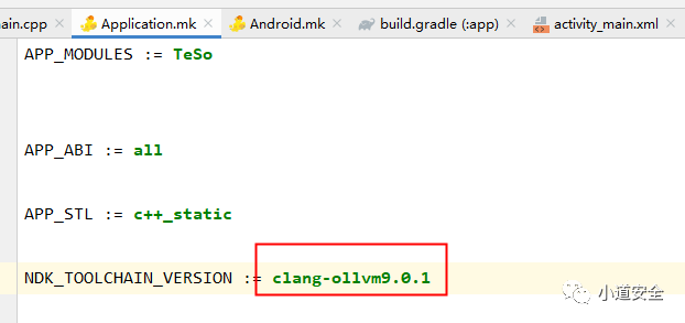 通过配置Application.mk文件,进行指定ollvm的clang具体版本数据(这个具体版本数据也可以lib文件夹下clang文件夹下查看)。