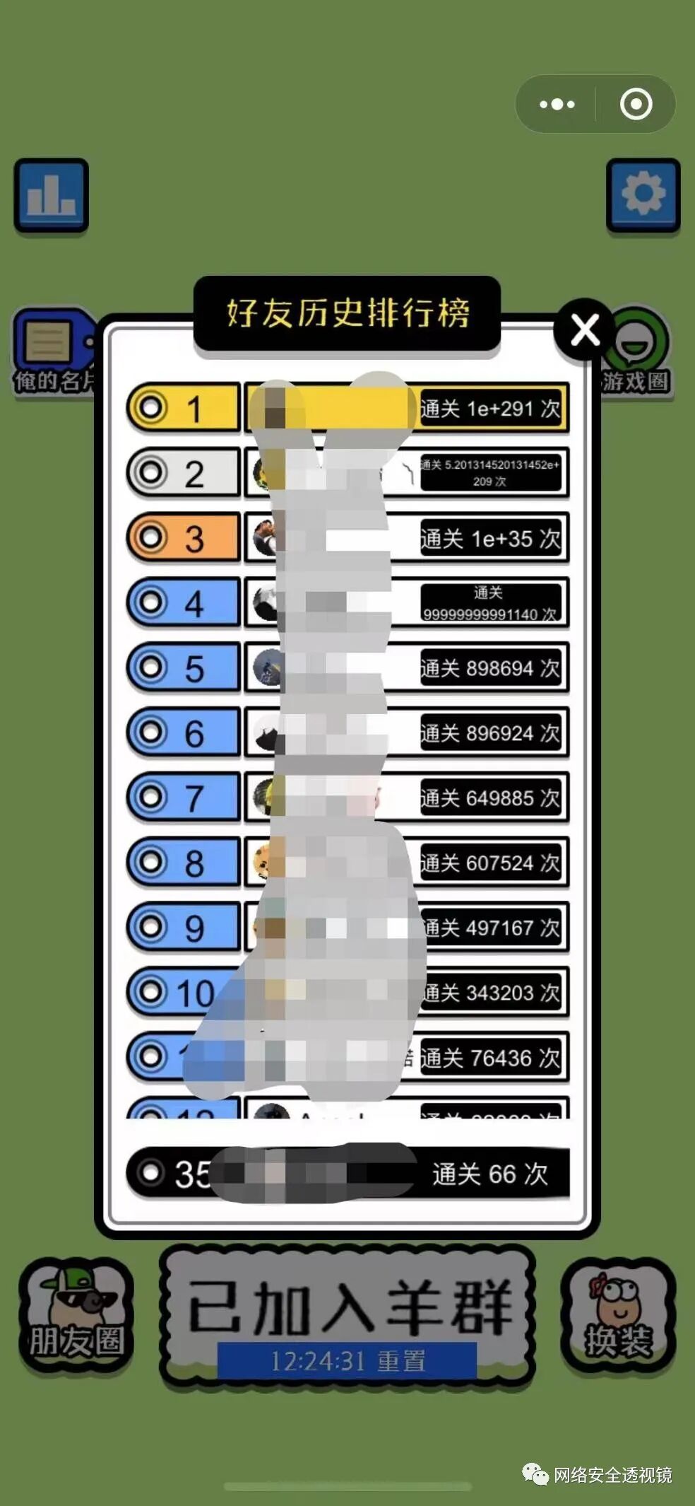 小程序安全性可以说是很糟糕,以上是最复杂的一种方法。程序对发过来的数据包,缺少基本的会话管理,访问控制。除了上述方法,还有其他方法。比如:抓取第二关失败的包,将参数rank_state=2 改成1就好了,还有将返回排行榜返回参数daily_count包,本地文件修改等。由于这个游戏很火,没有进一步做测试,奉劝大家别玩的过火呀!!!