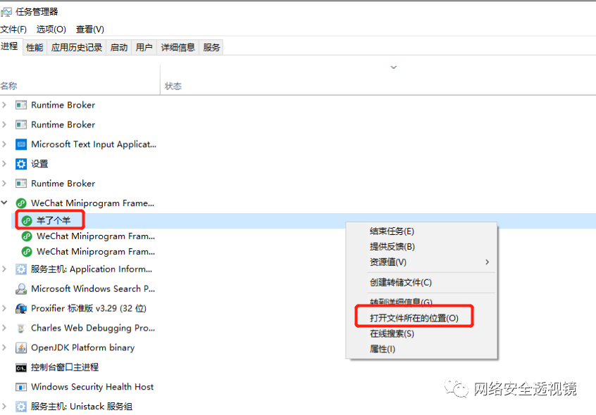其中wechatappex.exe 这个程序就是羊了个羊电脑端小程序的名字,微信打开小程序,通过任务管理器,右击查看进程对应的程序。