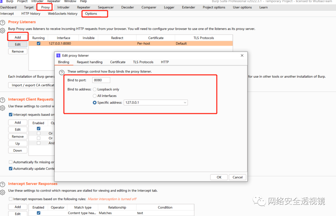 1.2 启动后,进入Proxy -->Option 设置本地监听端口。默认是127.0.0.1 8080端口