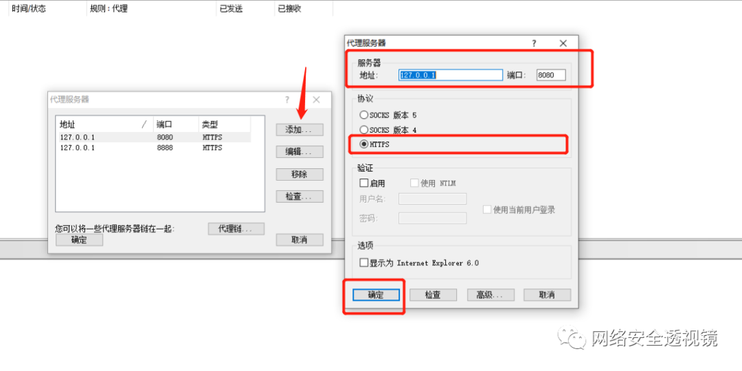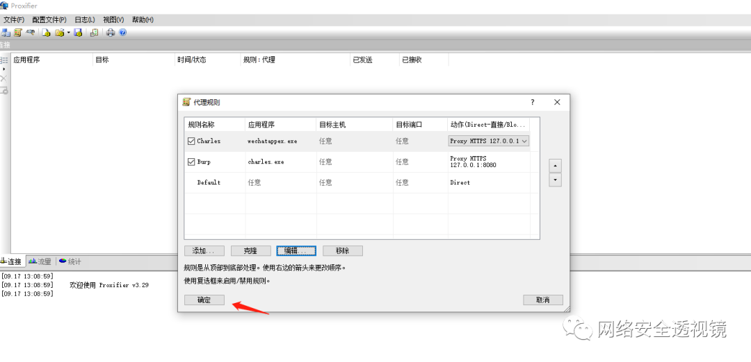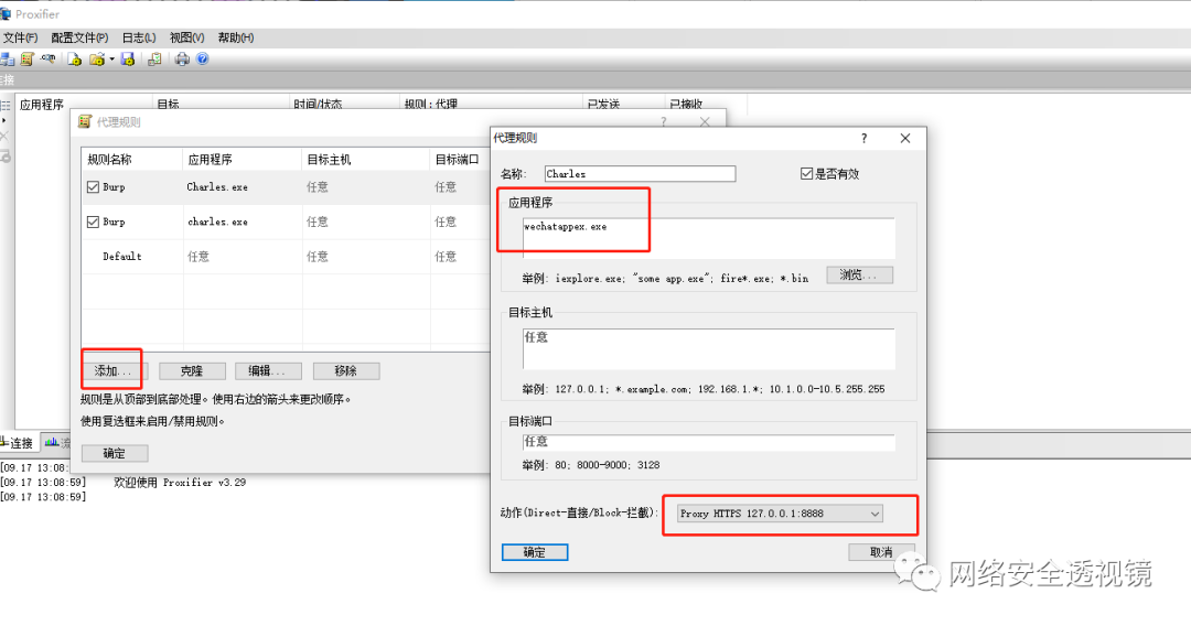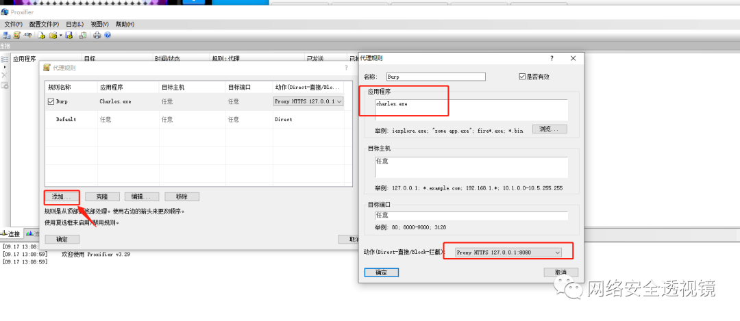点击配置文件--> 代理规则-->添加规则,分别将Charles 和Burp 端口添加进去。