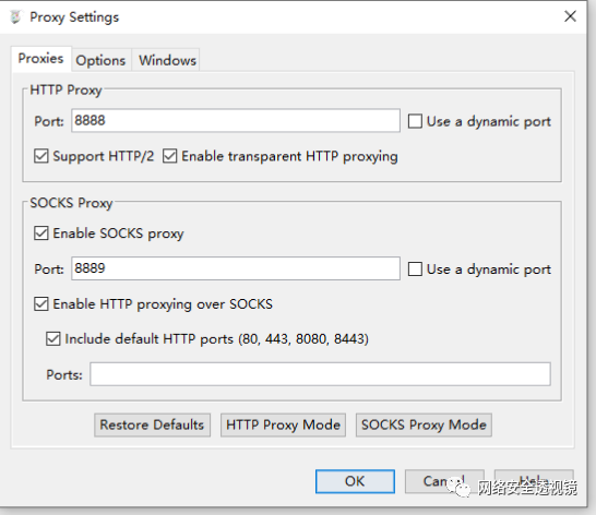 2.3 设置代理。点击Proxy --> Proxy Settings 安装默认配置即可,端口默认8888 这些不用更改。