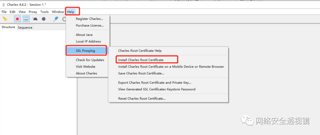 2.2 点击Help --->SSL Proxying ---> Install Charles Root Certificate 安装根证书