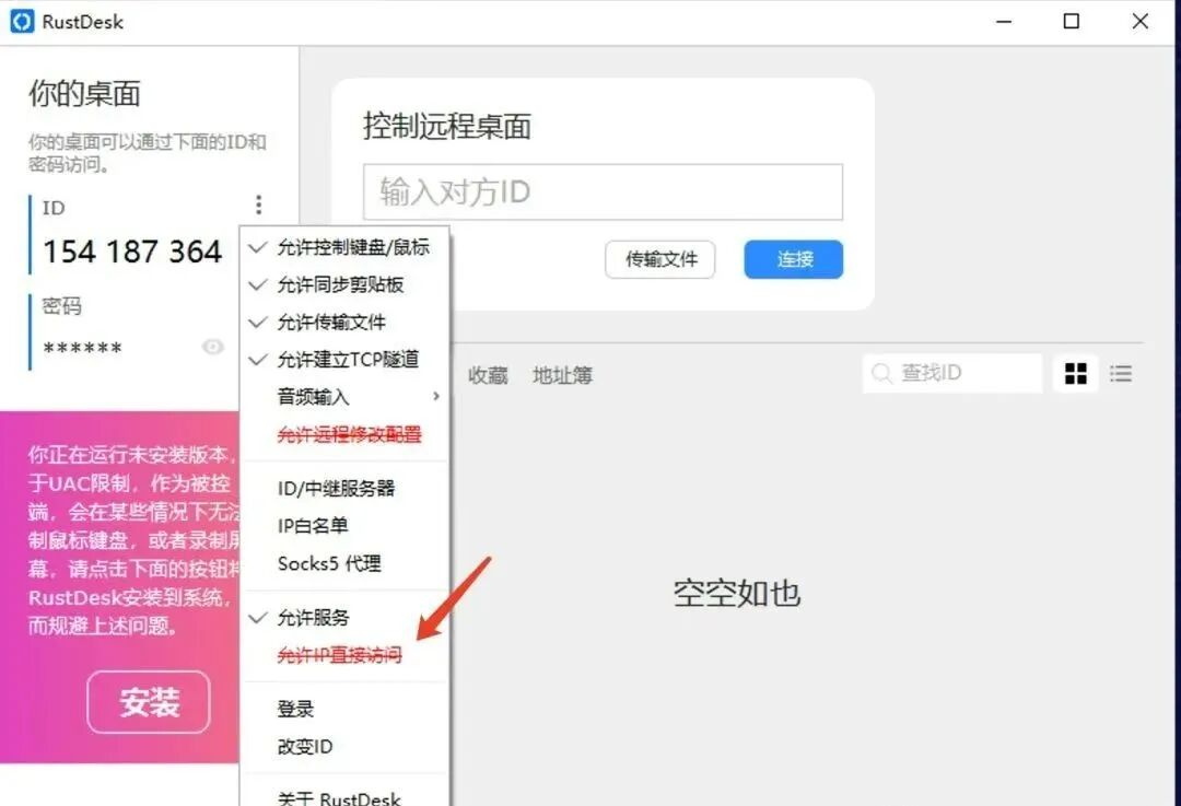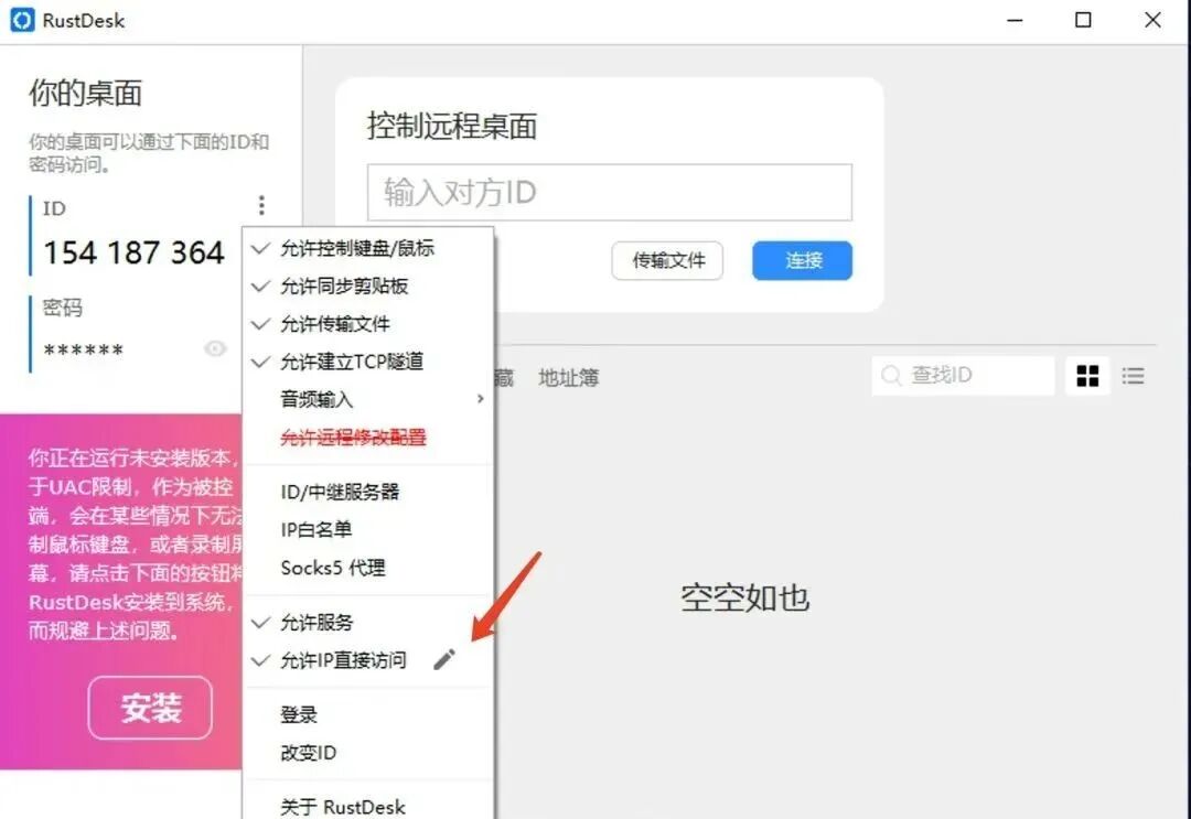 在RustDesk默认设置中,允许IP直接访问功能未开启,如下图: