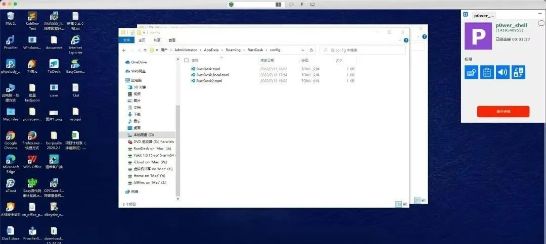 (2)不知道是不是RustDesk的bug还是出于安全考虑,如果是第一次在目标上运行RustDesk,RustDesk不会立即将密码保存到配置文件,而此时你把鼠标放在显示密码时则会保存到文件,遇到这种情况我们只需运行RustDesk,生成配置文件后结束RustDesk进程,然后修改配置文件里password为指定密码,再运行RustDesk即可。