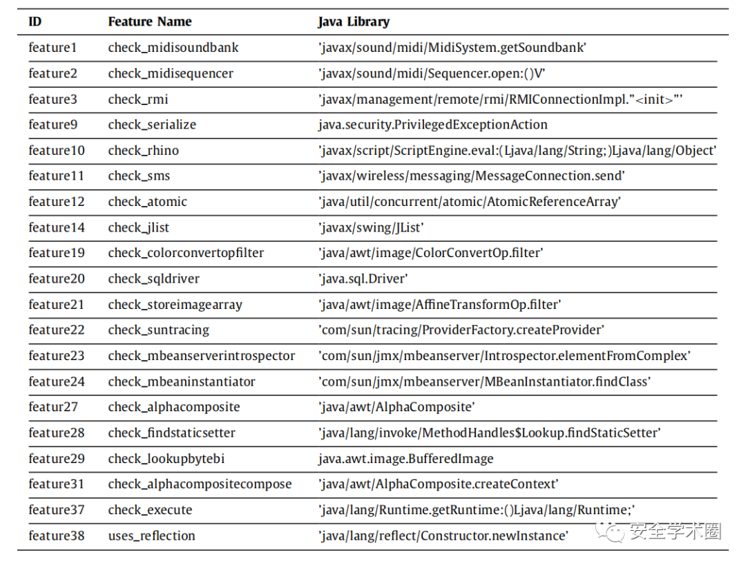 Jarhead主要提取两种特征:混淆特征和行为特征。具体来说,Jarhead从字节码的反汇编代码中提取统计信息来表示混淆特征,如:是否存在Java对象的特定实例,字符串长度等;行为特征包括下载和执行外部文件等。Jarhead从Java直接码中总共提取42个特征,而本文模型梯度推进算法(gradient boosting algorithm)从这42个特征中选择出20个特征,如表1所示。本文所用到的特征可以分为两大类:已知存在漏洞的函数(如:MidiSystem.getSoundbank),下载和执行行为(如:java.net.URL)。