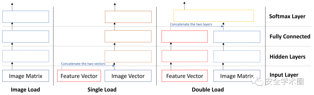 基于CNN的分类引擎需要接收字节码转换引擎获得的灰度图和特征提取引擎提取的特征,因此需要对这两种输入进行组合。图3是作者探究的几种不同的输入组合方式。