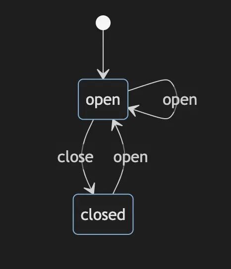 状态机大体上可以分为两部分:状态和驱动状态变化的事件。首先我们来定义一个门的状态机,它有两个状态open,closed。对应的有两个事件open和close来驱动状态机状态的变化。