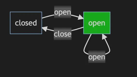 fsm := fsm.NewFSM("closed",fsm.Events{{Name: "open", Src: []string{"closed", "open"}, Dst: "open"},{Name: "close", Src: []string{"open"}, Dst: "closed"},},fsm.Callbacks{//事件之前"before_open": func(e *fsm.Event) {fmt.Println("before_open")e.Async()},"before_event": func(e *fsm.Event) {fmt.Println("before_event")e.Async()},//离开老状态之前"leave_closed": func(e *fsm.Event) {fmt.Println("leave_closed")e.Async()},"leave_state": func(e *fsm.Event) {fmt.Println("leave_state")e.Async()},//进入新状态之前"enter_open": func(e *fsm.Event) {fmt.Println("enter_open")e.Async()},"enter_state": func(e *fsm.Event) {fmt.Println("enter_state")e.Async()},//事件执行之后"after_open": func(e *fsm.Event) {fmt.Println("after_open")e.Async()},"after_event": func(e *fsm.Event) {fmt.Println("after_event")e.Async()},},)if err := fsm.Event("close"); err != nil {fmt.Println(err)}if err := fsm.Event("open"); err != nil {fmt.Println(err)}fmt.Println(fsm.Current())err := fsm.Transition()if err != nil {fmt.Println(err)}fmt.Println(fsm.Current())graphviz, _ := vfsm.VisualizeWithType(fsm, "graphviz")ioutil.WriteFile("fsm.graphviz", []byte(graphviz), fs.ModePerm)diagram, _ := vfsm.VisualizeWithType(fsm, "mermaid-state-diagram")ioutil.WriteFile("fsm.diagram.md", []byte("```mermaid\n"+diagram+"\n```"), fs.ModePerm)flowChart, _ := vfsm.VisualizeWithType(fsm, "mermaid-flow-chart")ioutil.WriteFile("fsm.flowChart.md", []byte("```mermaid\n"+flowChart+"\n```"), fs.ModePerm)