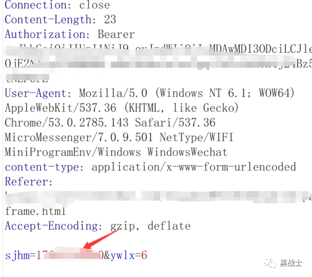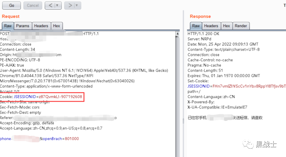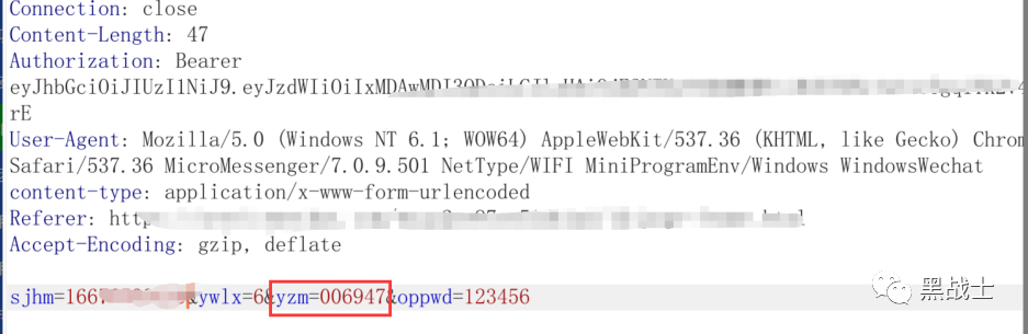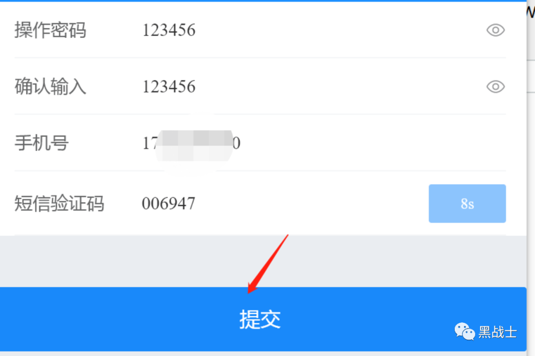 点击提交,抓包改成其他刚刚接收短信的手机号