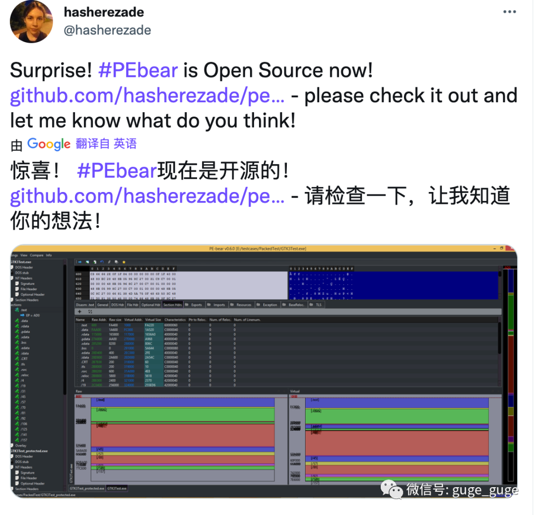 懂的自然懂,转需:PE-bear 是一个多平台的 PE 文件逆向工具,其目标是为恶意软件分析工程师提供快速灵活的“第一视图”,稳定且能够快速处理格式错误的 PE 文件。https://github.c