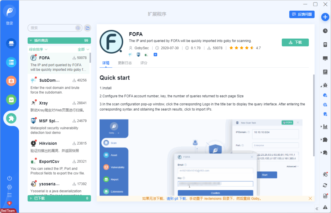 子域名扫描:自动爬取子域名,AXFR 监测,二级域名字典爆破,关联域名查询。同时支持连接 FOFA,扩大数据源。