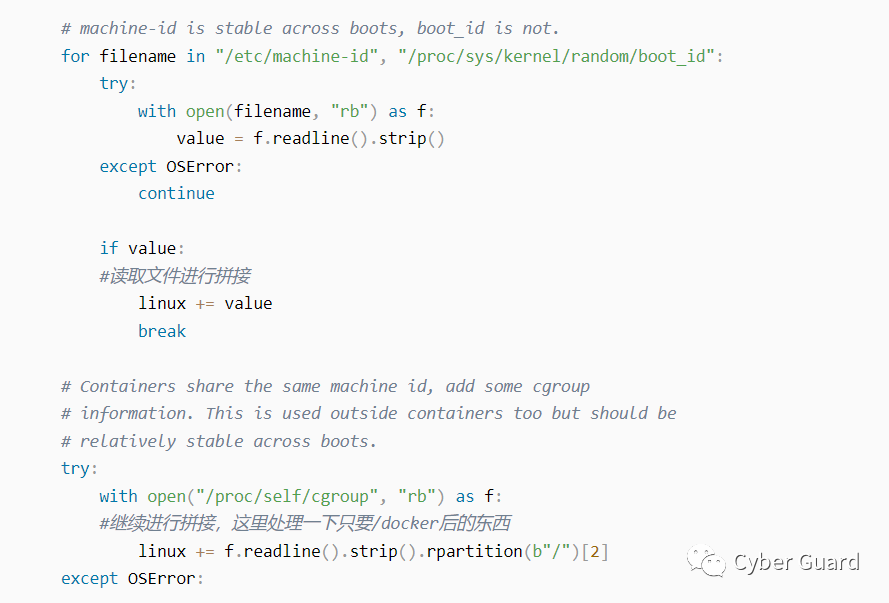 '96cec10d3d9307792745ec3b85c896209361435ac3de86b68f6b5282b8bc57435c57c9096554c72c7f5a5bc591939427'# /etc/machine-id 拼接上/proc/self/cgroup