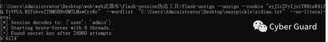 flask-unsign --unsign --cookie "eyJ1c2VyIjoiYWRtaW4ifQ.YyVFUA.RSTsbveITHMSD9v0MTLMswCryRc" --wordlist "C:\Users\Administrator\Desktop\easypickle\zidian.txt" --no-literal-eval