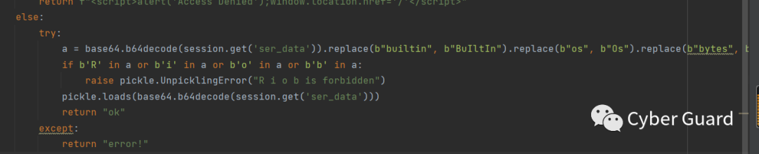 a = base64.b64decode(session.get('ser_data')).replace(b"builtin", b"BuIltIn").replace(b"os", b"Os").replace(b"bytes", b"Bytes")