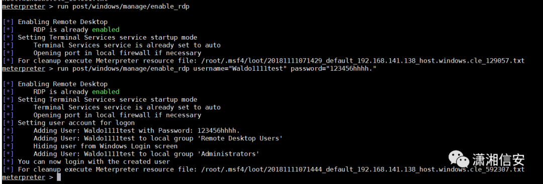 run post/windows/manage/enable_rdp添加用户